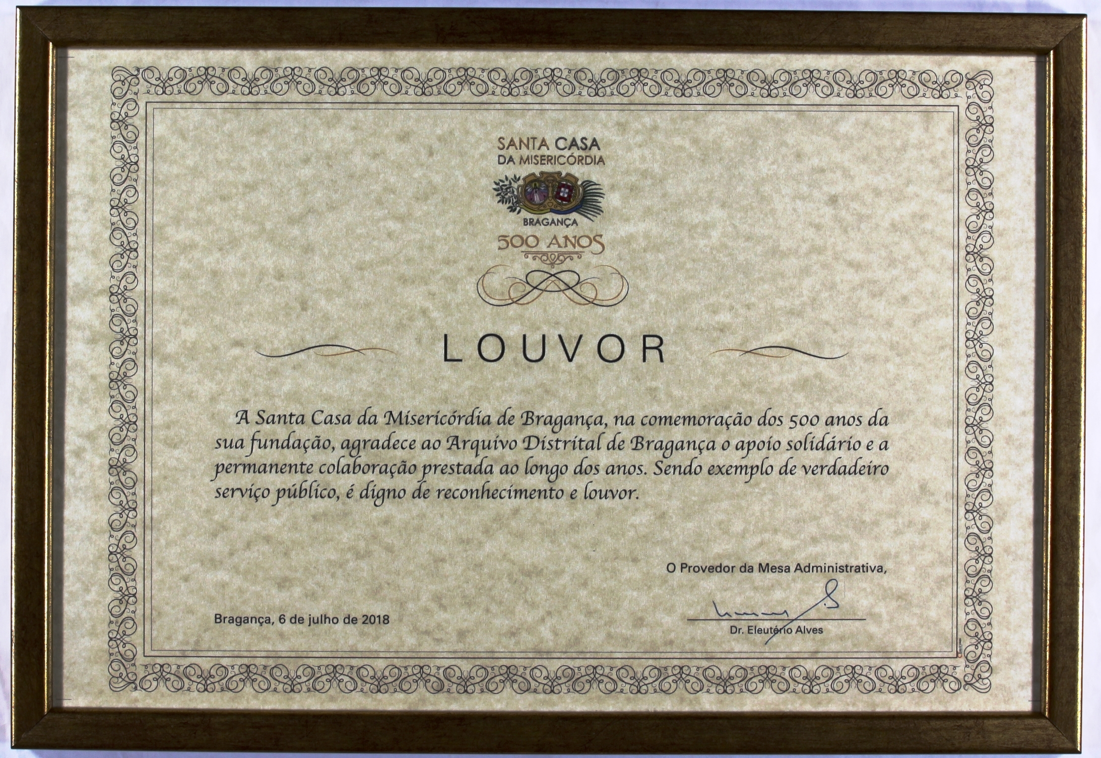 No âmbito das comemoração dos 500 anos da Santa Casa da Misericórdia, no dia 6 de julho de 2018, o Dr. Eleutério Alves, Provedor da Santa Casa da Misericórdia de Bragança, atribuiu um louvor ao Arquivo Distrital de Bragança pelo apoio solidário e, a permanente colaboração prestada ao longo dos anos. Esta distinção reconhece, honra e, distingue, o Arquivo Distrital de Bragança, como exemplo de verdadeiro serviço público.  Louvor ao Arquivo Distrital de Bragança