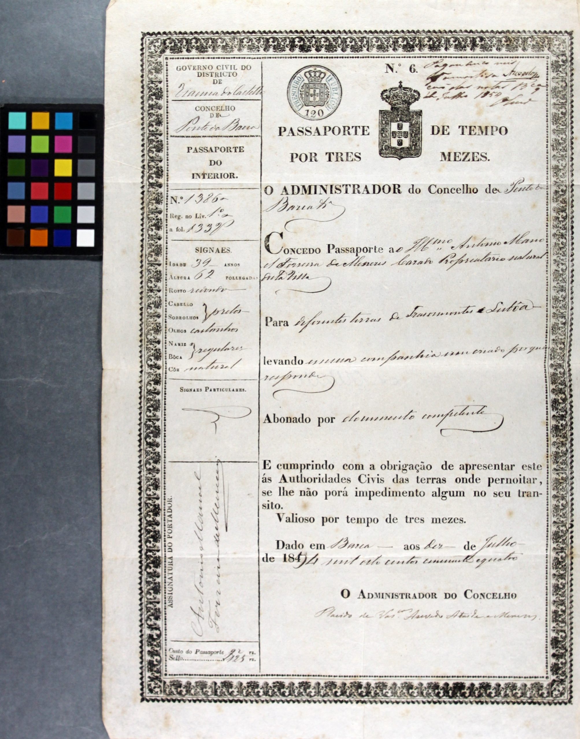 Assim, destacamos um documento o Passaporte concedido a António Manoel Ferreira Menezes, em regime de mobilidade interna no território português, para diferentes terras de Trás-os-Montes e Lisboa. Não deixa de suscitar curiosidade este documento, pela sua singularidade. A partir dele, diferentes leituras transdisciplinares emanam.