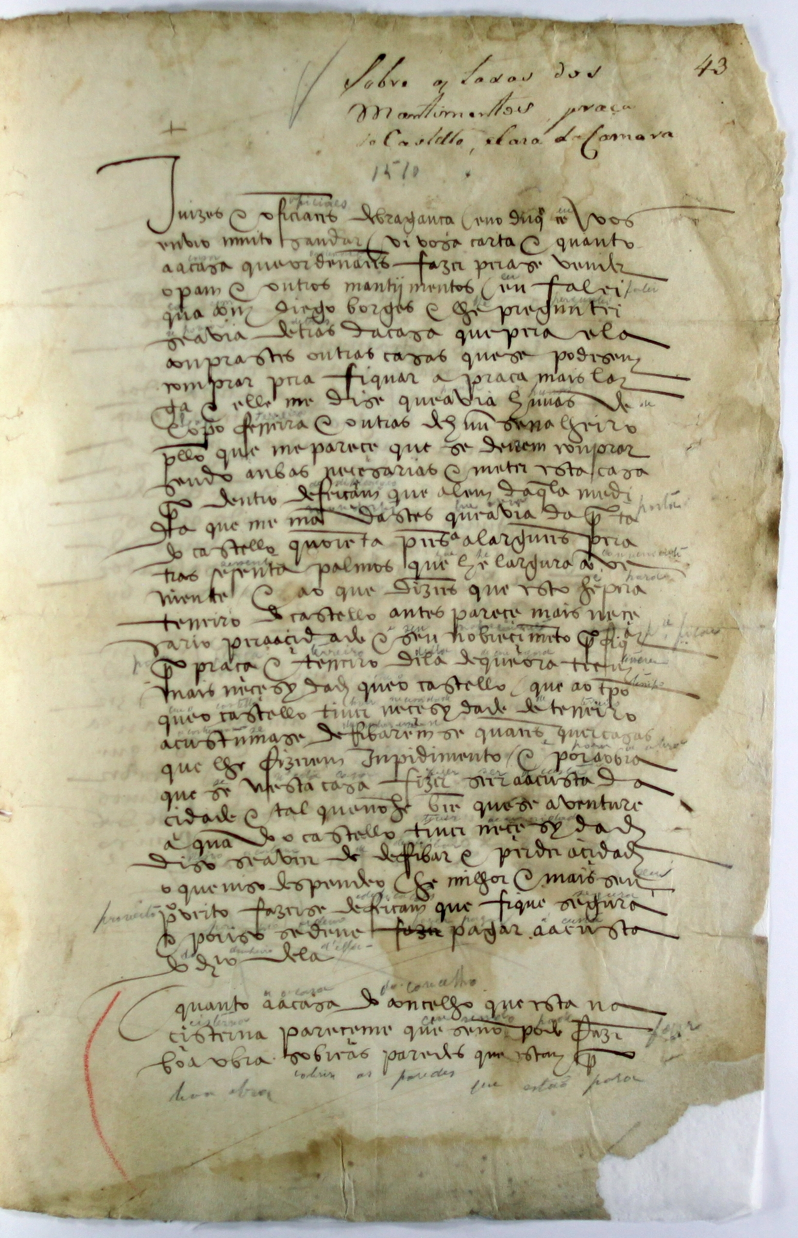 «Juizes e oficiaes de Bragança eu o duque vos envio muito saudar vi vosa carta e quanto aa casa que ordenais fazer pera se vender o pam e outros mantimentos eu falei qua com Diogo Borges e lhe preguntei se abia detraz da casa que pera elo comprastes outras casas que se podesem comprar pera fiquar a praça mais larga e elle me dise que abia humas de Lopo Ferreira e outras de un seralheiro pello que me parece que se devem comprar sendo anbas necesarias e meter esta casa pera dentro de feiçam que alem daquela medida que me mandastes que abia da porta do castelo quorenta passos a largura pera tras sesenta palmos que he largura conveniente / e ao que dizeis que este he pera terreiro do castello antes parece mais necesario pera a cidade e seu nobrecimento pera fiquar pera praça e terreiro dela de que ora teem mais necesidade que o castello que ao tempo que o castello tiver necesydade de terreiro acustumase derribaromse quaesquer casas que lhe fizesem impedimento / e por a obra que se nesta casa fizer ser a custa da cidade e tal que nom he bem que se aventure a quando o castello tiver necesidade diso se aber de derribar e perder a cidade o que niso despendeo he milhor e mais seu proveito fazerse de feiçam que fique segura e pois se deve fazer pagar aa custa do dinheiro dela. Quanto aa casa do concelho que esta na cisterna pareceme que se non pode fazer boa obra sobre as paredes que estam por serem esgonças e devese de fazer la huma casa por esquadria dandolhe o comprimento e largura o mais que poder ser sobre aquelle chaão e podese derribar pera iso as duas ou tres paredes ate o lageamento que non se perde niso mais que o feitio pois que a cantaria hi fiqua e a altura das paredes des o lageamento atee a armação deve de ser de quatro varas e mea e a armaçam deve de ser feita de boa madeira e bem lavrada e develhe de fazer algũuas janelas de modo que se agora acustuma e nisto deveis de praticar com Lopo de Sousa que sabera dar pera iso boo conselho de Vila Viçosa a bij dias de Janeiro de 1510. E quanto aa oura da praça desa par me parece escusada como ja tenho escrito e em nenhûa maneira a deveis de fazer porque são cousas que em nenhûa maneira se teer concertadas e olhai que desde a porta do castello aa casa hade aver os R [40] passos e mais os Lx palmos e agradeçovos o boo cuidado que tendes das cousas desa cidade e do meu serviço e asy de mas fazerdes saber. o duque» (215).